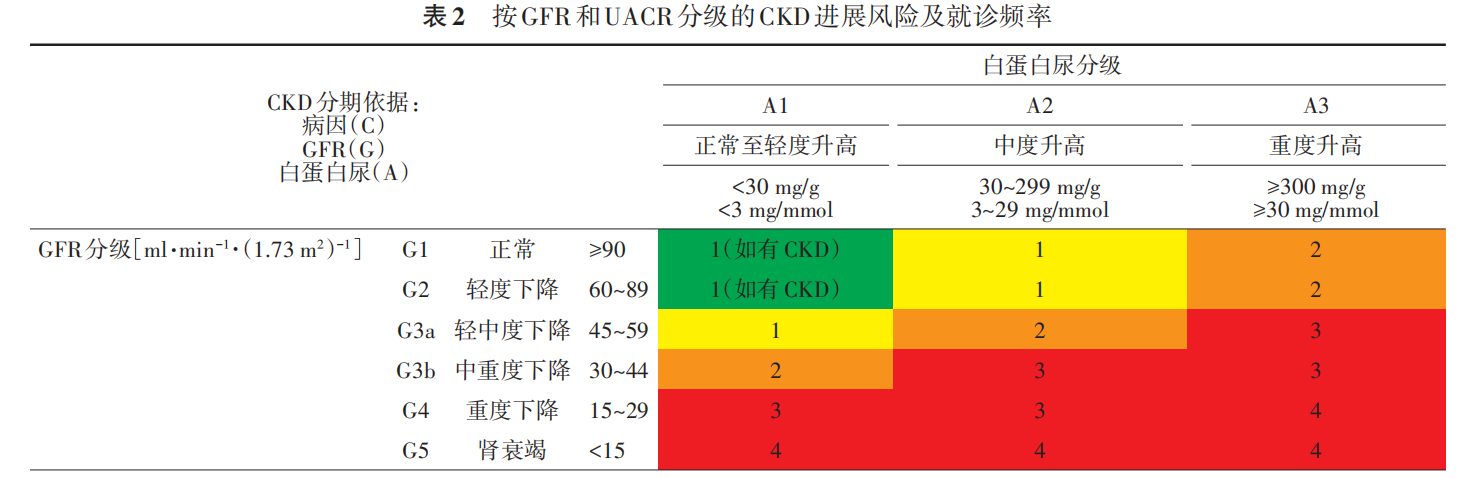注:GFR為腎小球?yàn)V過率;UACR為尿白蛋白/肌酐比值;CKD為慢性腎臟?。槐砀裰械臄?shù)字為建議每年復(fù)查的次數(shù);背景顏色代表CKD進(jìn)展的風(fēng)險:綠色為低風(fēng)險,黃色為中風(fēng)險,橙色為高風(fēng)險,紅色為極高風(fēng)險