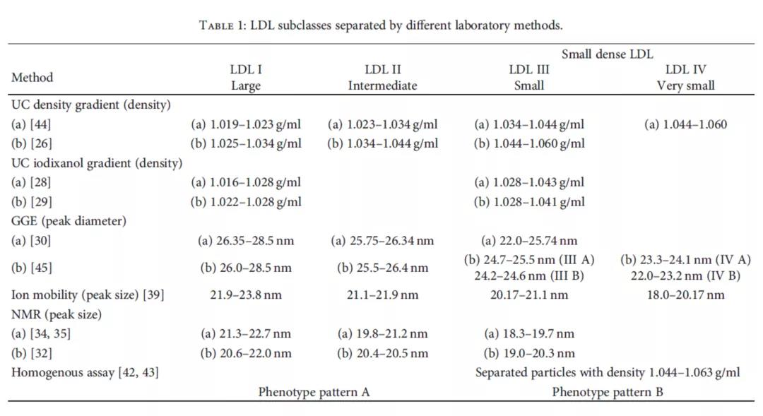 已知低密度脂蛋白的密度為 1.019~1.063 g/mL。在大多數(shù)研究中,利用超速離心手段對LDL顆粒分為3個亞類,LDL I、II 和 III 的密度分別為 1.025–1.034 g/mL、1.034–1.044 g/mL和 1.044–1.060 g/mL;利用梯度凝膠電泳 (GGE)手段對LDL顆粒分為 4個亞類,LDL I(26.0-28.5 nm)、LDL II(25.5-26.4 nm)、LDL III(small LDL ,24.2-25.5 nm)和 LDL IV(very small LDL ,22.0-24.1 nm); 核磁共振 (NMR) 可用于研究血漿中的脂蛋白類別,小密度低密度脂蛋白(Small Dense Low-Density Lipoprotein,sdLDL)通過 NMR 測定為粒徑為 18.0~20.5nm顆粒[3]。
